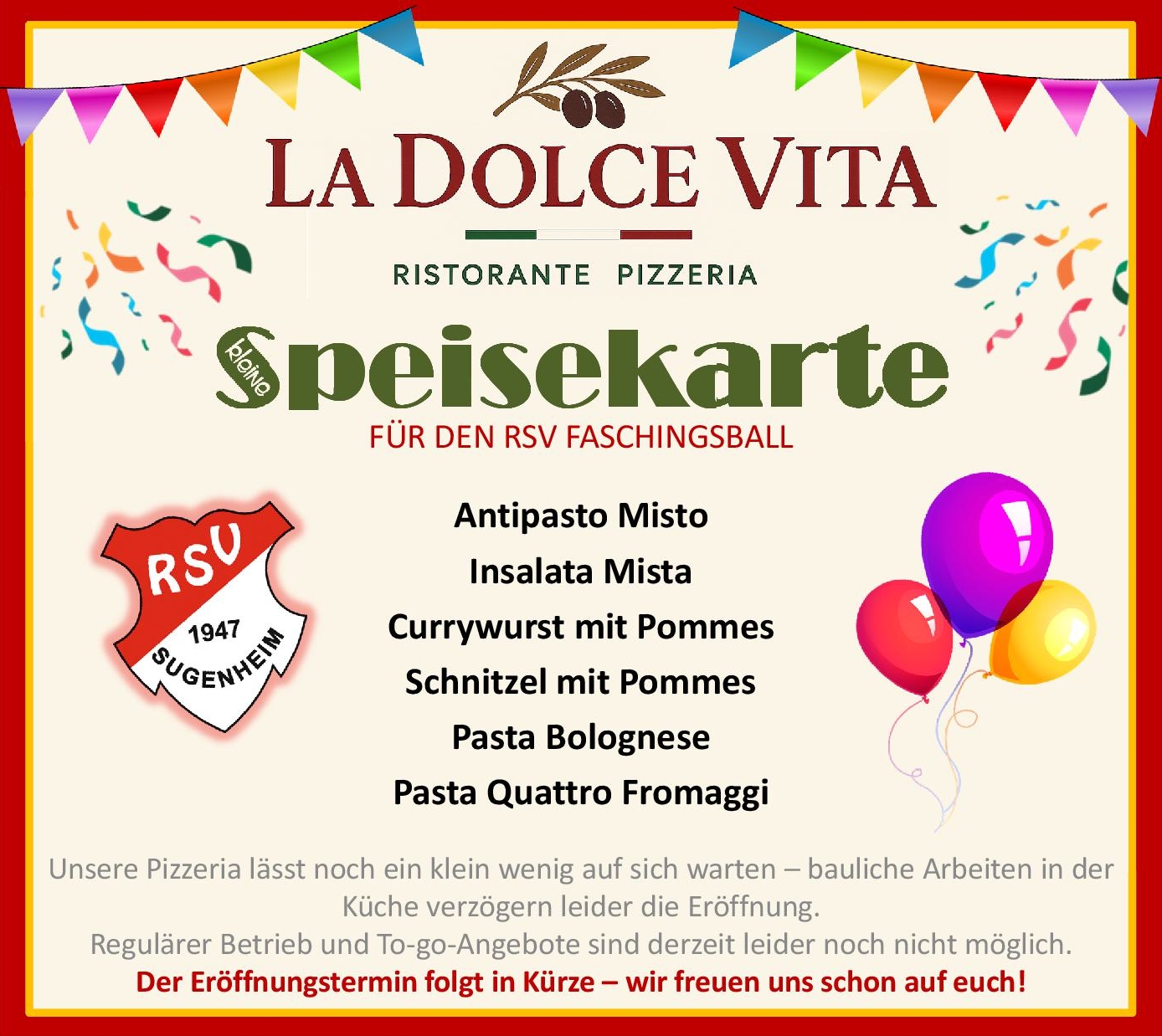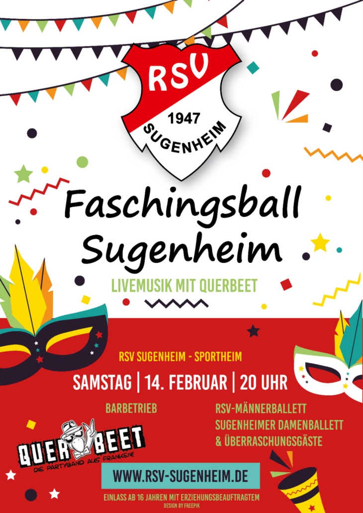 Ab 20:00 Uhr wird im RSV-Sportheim ausgelassen gefeiert. Für musikalische Highlights sorgt die Liveband „Querbeet“, während an der Bar beste Stimmung garantiert ist. Freuen dürft ihr euch außerdem auf leckeres Essen unserer neuen Pizzeria La Dolce Vita und beeindruckende Auftritte des RSV Damen- und Männerballetts, des Männerballetts Ullstadt sowie der Showtanzgruppe Altmannshausen.